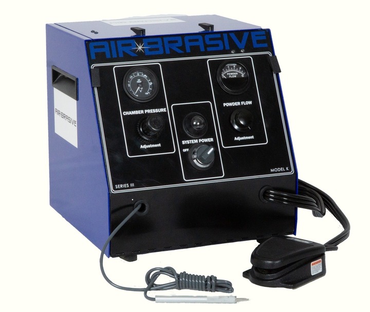 The Airbrasive Model K gives high volume producers the ability to micro-blast parts on production lines or in labs. This sturdy machine has been designed to accommodate both intermittent or continuous operations. Powder flow lines are reinforced with tungsten carbide fittings for the utmost reliability in a continuous operation. It utilizes our patented vibratory feed for uniform powder flow.